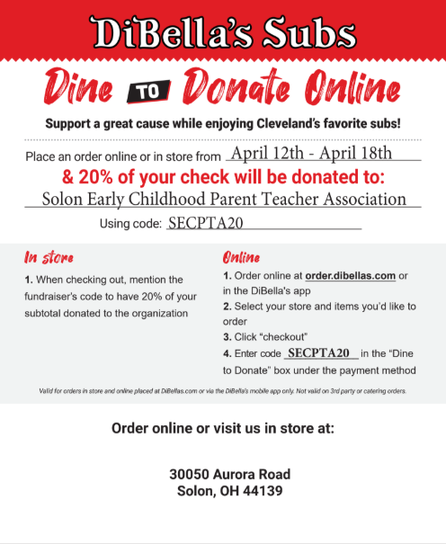 This Dine to Donate goes all week - Sunday, April 12th - Saturday, April 18th! Stop and grab some meals at DiBella's Subs in Solon (30050 Aurora Road). They will be donating 20% of sales to SECPTA.